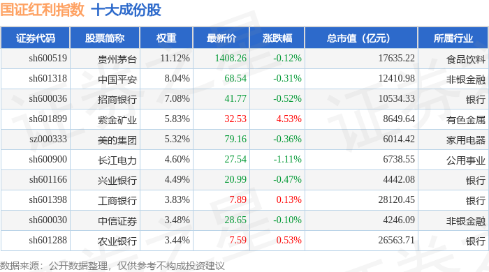 证券之星消息,12月22日,国证红利(399321)指数报收于7747.79点,涨0.05%,成交578.91亿元,换手率0.22%。当日该指数成份股中,上涨的有16家,紫金矿业以4.53%的涨幅领涨,下跌的有31家,中国电信以2.06%的跌幅领跌。