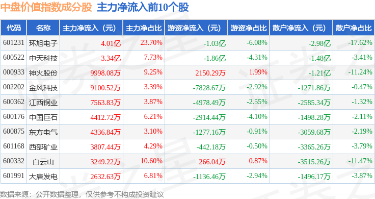 资金流向方面,中盘价值(399375)指数成份股当日主力资金净流出合计5.04亿元,游资资金净流出合计7985.95万元,散户资金净流入合计5.84亿元。成份股资金流向详情见下表: