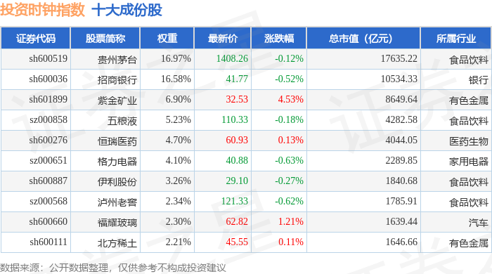 证券之星消息,12月22日,投资时钟(399391)指数报收于3340.72点,涨0.5%,成交816.83亿元,换手率1.0%。当日该指数成份股中,上涨的有40家,中国中免以10.0%的涨幅领涨,下跌的有54家,中国高科以9.99%的跌幅领跌。