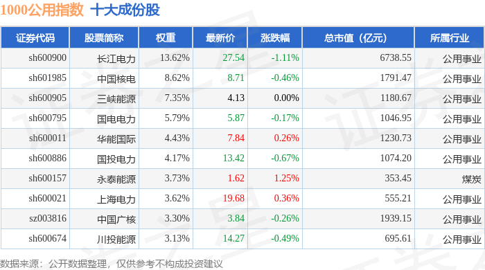证券之星消息,12月22日,1000公用(399390)指数报收于2656.84点,跌0.27%,成交158.1亿元,换手率0.62%。当日该指数成份股中,上涨的有15家,桂冠电力以3.35%的涨幅领涨,下跌的有23家,新奥股份以2.76%的跌幅领跌。