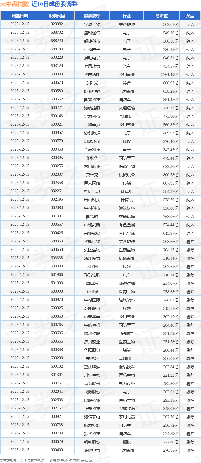 近10日内大中盘(399400)指数成份股做了调整,新纳入了26只股票,剔除了26只股票。