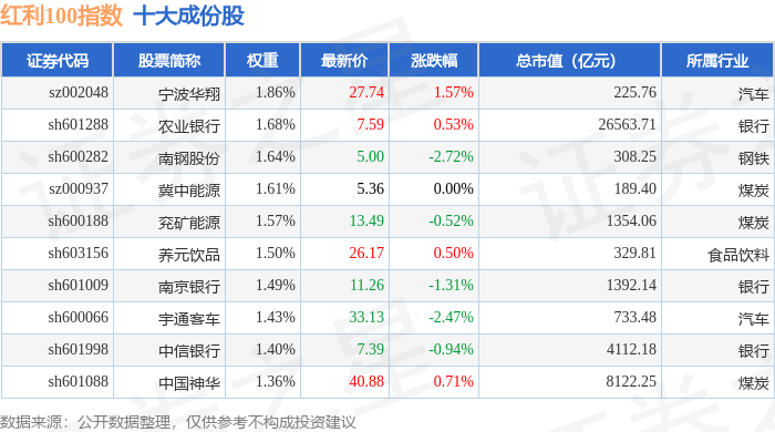 证券之星消息,12月22日,红利100(399411)指数报收于3442.01点,跌0.48%,成交352.75亿元,换手率0.23%。当日该指数成份股中,上涨的有24家,宁波富达以5.12%的涨幅领涨,下跌的有71家,南钢股份以2.72%的跌幅领跌。