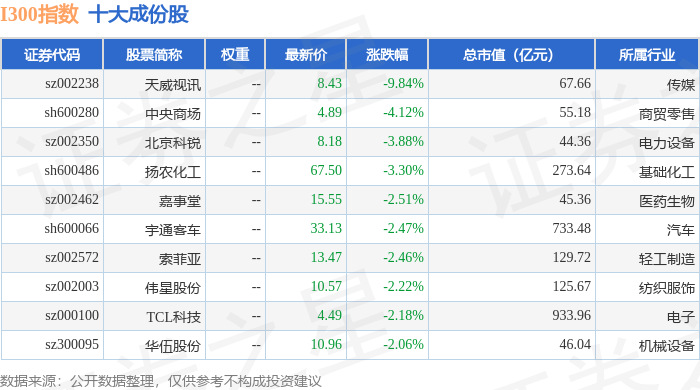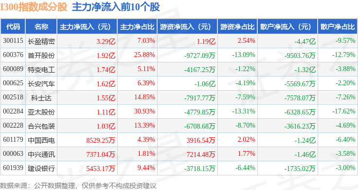 资金流向方面,I300(399416)指数成份股当日主力资金净流出合计16.51亿元,游资资金净流入合计12.48亿元,散户资金净流入合计4.03亿元。成份股资金流向详情见下表: