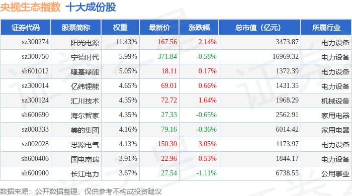 证券之星消息,12月22日,央视生态(399556)指数报收于2833.07点,涨0.61%,成交795.49亿元,换手率0.99%。当日该指数成份股中,上涨的有29家,卧龙电驱以9.99%的涨幅领涨,下跌的有18家,惠城环保以12.43%的跌幅领跌。