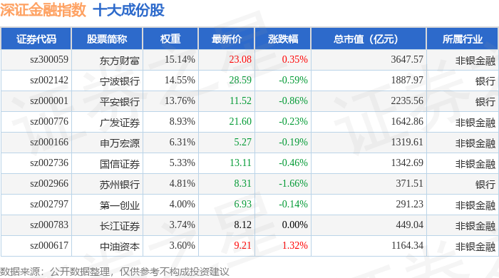 资金流向方面,深证金融(399619)指数成份股当日主力资金净流出合计4.12亿元,游资资金净流入合计9219.96万元,散户资金净流入合计3.2亿元。成份股资金流向详情见下表: