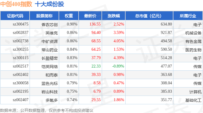 证券之星消息,12月22日,中创400(399624)指数报收于2483.04点,涨1.39%,成交2588.32亿元,换手率2.55%。当日该指数成份股中,上涨的有255家,珂玛科技以20.0%的涨幅领涨,下跌的有135家,惠城环保以12.43%的跌幅领跌。