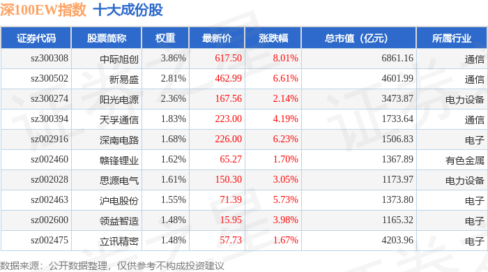 证券之星消息,12月22日,深100EW(399632)指数报收于5181.26点,涨0.96%,成交2100.66亿元,换手率1.07%。当日该指数成份股中,上涨的有57家,东山精密以8.2%的涨幅领涨,下跌的有40家,华利集团以2.84%的跌幅领跌。