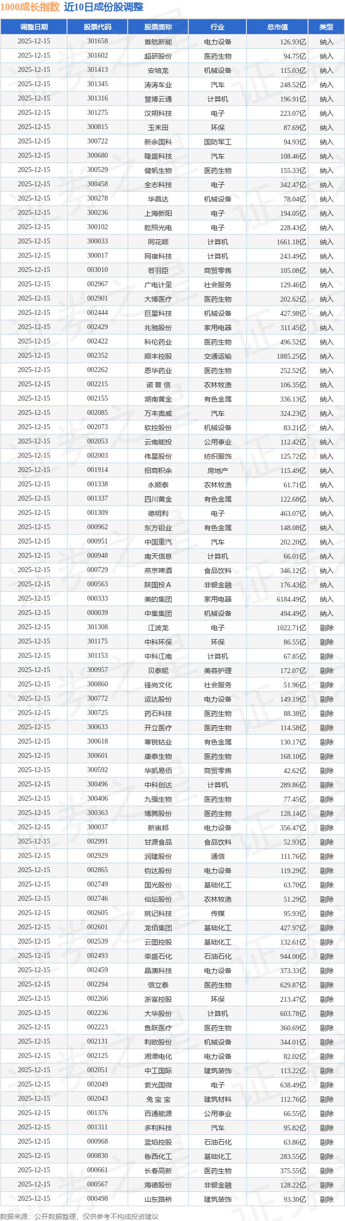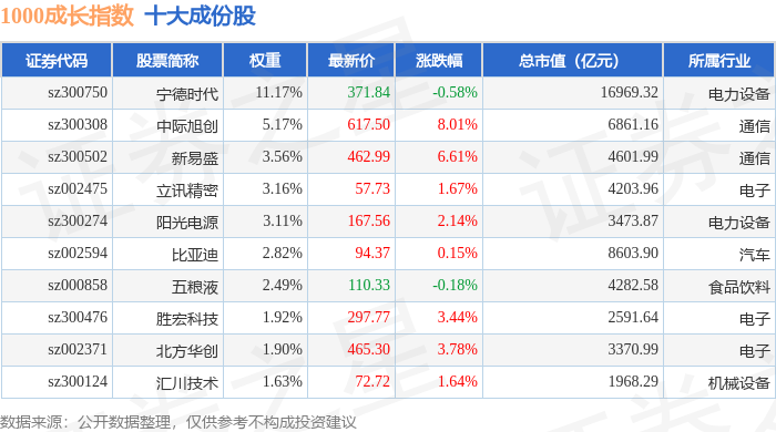 1000成长(399630)指数十大成份股详情如下: