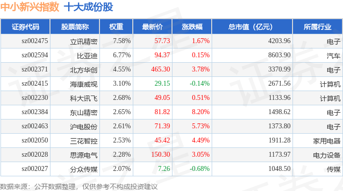 证券之星消息,12月22日,中小新兴(399642)指数报收于2287.61点,涨1.97%,成交1331.78亿元,换手率2.06%。当日该指数成份股中,上涨的有72家,高德红外以10.04%的涨幅领涨,下跌的有26家,美年健康以6.75%的跌幅领跌。