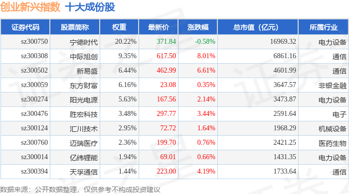 创业新兴(399643)指数十大成份股详情如下: