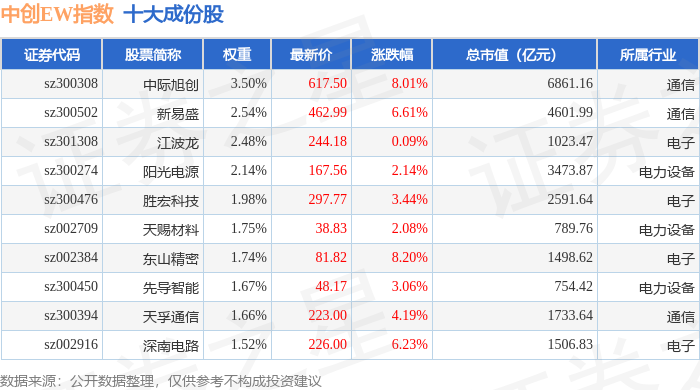 中创EW(399660)指数十大成份股详情如下: