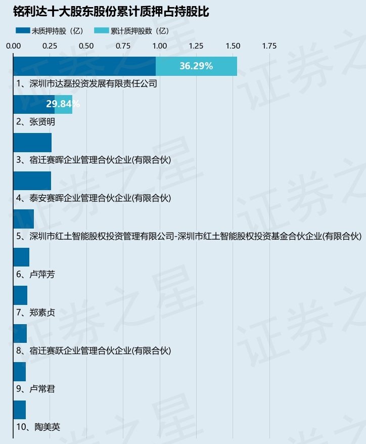 截止本公告日,股东深圳市达磊投资发展有限责任公司已累计质押股份5548.72万股,占其持股总数的36.29%,股东张贤明已累计质押股份1200.0万股,占其持股总数的29.84%。本次质押后铭利达十大股东的累计质押股份占持股比例(占持股比例的计算以公司最新一期财务报表公布的十大股东的持股总数为基准)见下图: