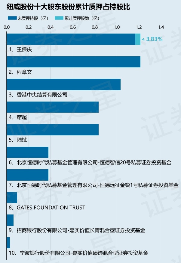 截止本公告日,股东王保庆已累计质押股份465.0万股,占其持股总数的3.83%。本次质押后纽威股份十大股东的累计质押股份占持股比例(占持股比例的计算以公司最新一期财务报表公布的十大股东的持股总数为基准)见下图: