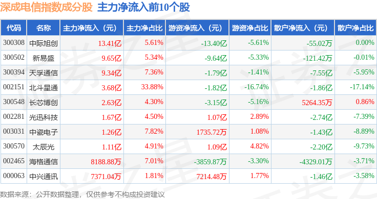 资金流向方面,深成电信(399688)指数成份股当日主力资金净流入合计41.42亿元,游资资金净流出合计26.07亿元,散户资金净流出合计15.36亿元。成份股资金流向详情见下表: