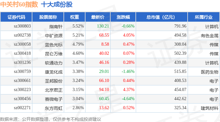 证券之星消息,12月22日,中关村60(399697)指数报收于3597.2点,涨0.87%,成交387.35亿元,换手率2.99%。当日该指数成份股中,上涨的有41家,北斗星通以9.99%的涨幅领涨,下跌的有18家,赛微电子以4.64%的跌幅领跌。