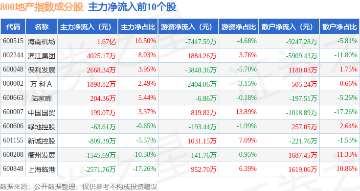 资金流向方面,800地产(399965)指数成份股当日主力资金净流入合计5571.69万元,游资资金净流入合计1852.08万元,散户资金净流出合计7423.77万元。成份股资金流向详情见下表: