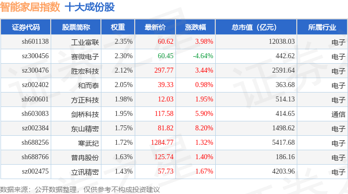 证券之星消息,12月22日,智能家居(399996)指数报收于4437.74点,涨1.24%,成交1265.62亿元,换手率1.74%。当日该指数成份股中,上涨的有73家,环旭电子以10.02%的涨幅领涨,下跌的有27家,匠心家居以7.2%的跌幅领跌。