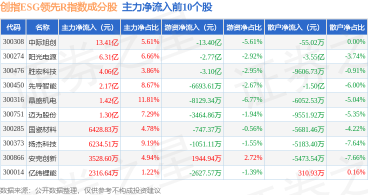 资金流向方面,创指ESG领先R(470031)指数成份股当日主力资金净流入合计13.09亿元,游资资金净流出合计16.09亿元,散户资金净流入合计3.0亿元。成份股资金流向详情见下表: