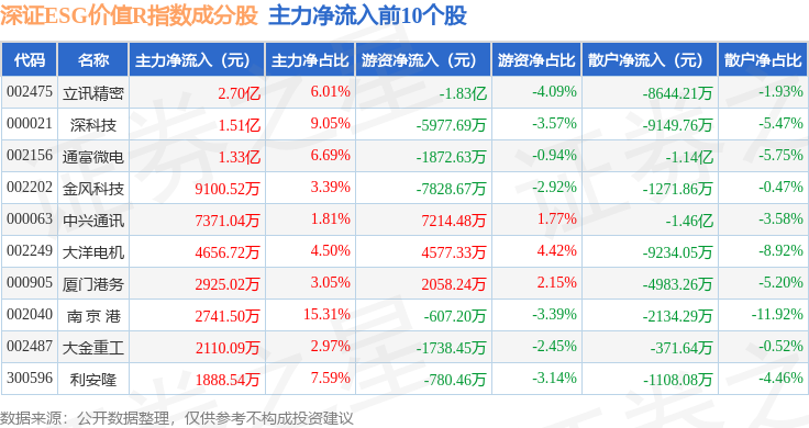 资金流向方面,深证ESG价值R(470061)指数成份股当日主力资金净流出合计4143.85万元,游资资金净流出合计3484.64万元,散户资金净流入合计7628.5万元。成份股资金流向详情见下表:
