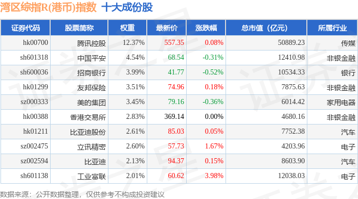 湾区综指R(港币)(480004)指数十大成份股详情如下: