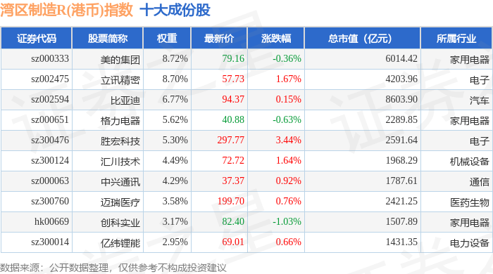 湾区制造R(港币)(480010)指数十大成份股详情如下: