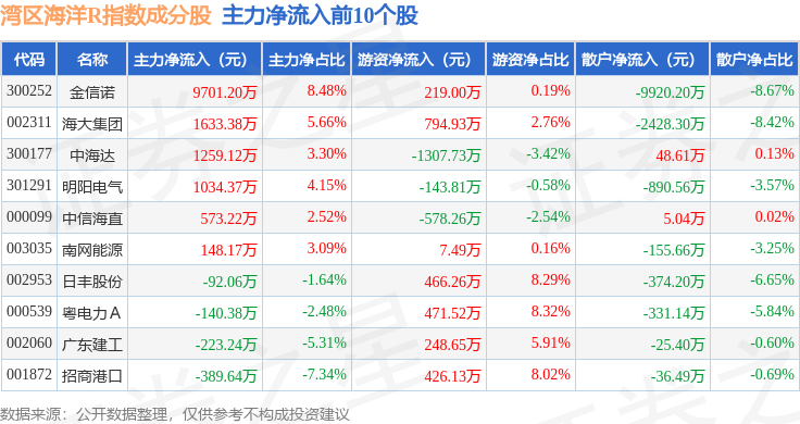 资金流向方面,湾区海洋R(480019)指数成份股当日主力资金净流入合计1052.11万元,游资资金净流出合计1362.75万元,散户资金净流入合计310.64万元。成份股资金流向详情见下表: