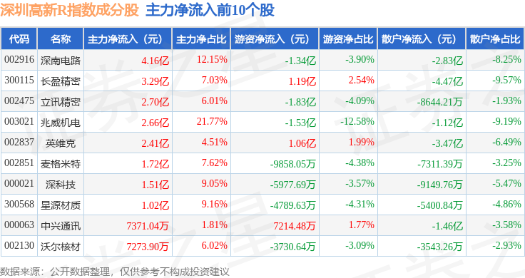 资金流向方面,深圳高新R(480038)指数成份股当日主力资金净流入合计13.87亿元,游资资金净流出合计3.02亿元,散户资金净流出合计10.85亿元。成份股资金流向详情见下表: