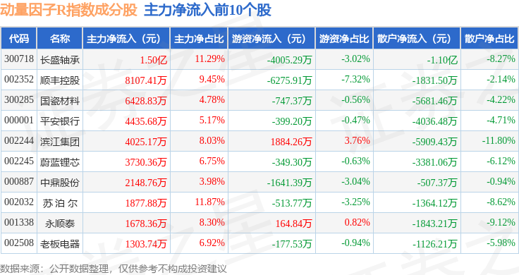 资金流向方面,动量因子R(480057)指数成份股当日主力资金净流入合计421.92万元,游资资金净流入合计2.4亿元,散户资金净流出合计2.44亿元。成份股资金流向详情见下表: