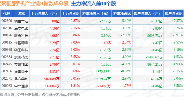 资金流向方面,深港通手机产业链R(483009)指数成份股当日主力资金净流入合计15.39亿元,游资资金净流出合计7.01亿元,散户资金净流出合计8.39亿元。成份股资金流向详情见下表: