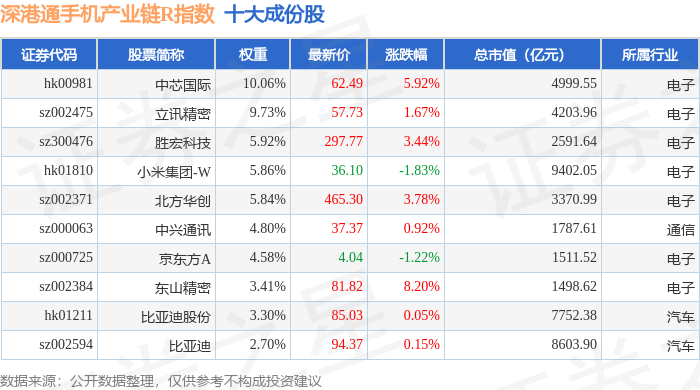 深港通手机产业链R(483009)指数十大成份股详情如下: