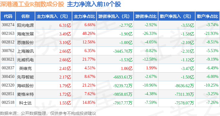 资金流向方面,深港通工业R(483017)指数成份股当日主力资金净流入合计10.85亿元,游资资金净流出合计11.06亿元,散户资金净流入合计2117.45万元。成份股资金流向详情见下表: