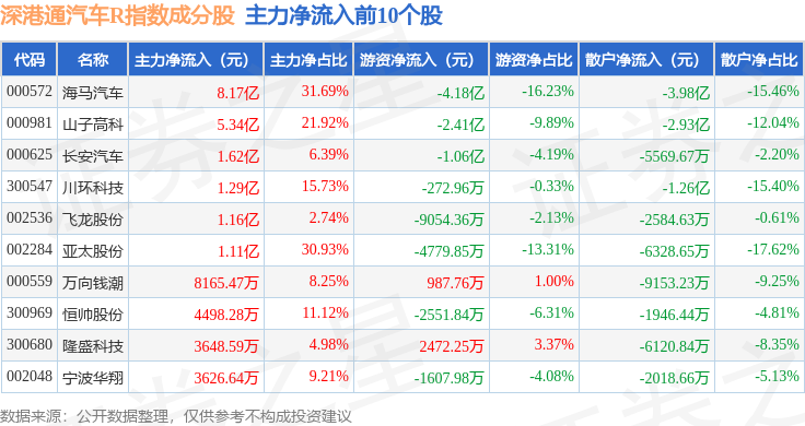 资金流向方面,深港通汽车R(483039)指数成份股当日主力资金净流入合计5.39亿元,游资资金净流出合计6.52亿元,散户资金净流入合计1.13亿元。成份股资金流向详情见下表: