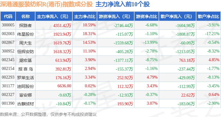 资金流向方面,深港通服装纺织R(港币)(483042)指数成份股当日主力资金净流出合计1.48亿元,游资资金净流入合计1768.05万元,散户资金净流入合计1.31亿元。成份股资金流向详情见下表: