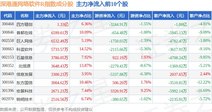 资金流向方面,深港通网络软件R(483047)指数成份股当日主力资金净流出合计18.15亿元,游资资金净流入合计5.09亿元,散户资金净流入合计13.07亿元。成份股资金流向详情见下表: