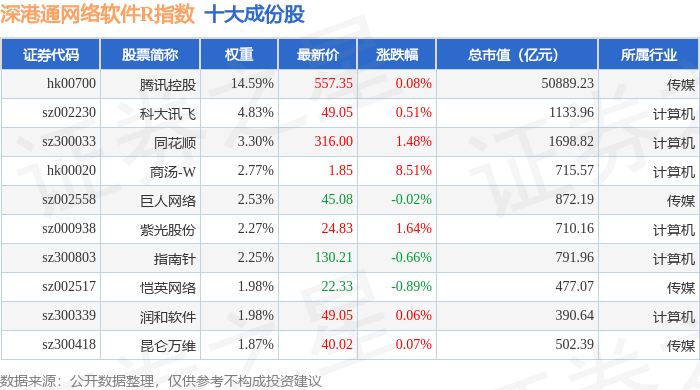 深港通网络软件R(483047)指数十大成份股详情如下: