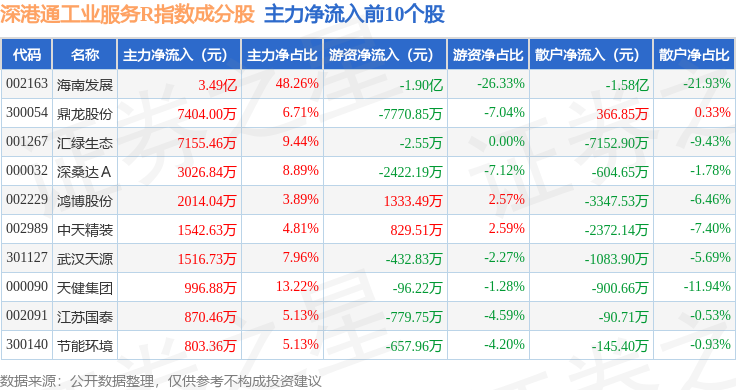 资金流向方面,深港通工业服务R(483055)指数成份股当日主力资金净流出合计2539.94万元,游资资金净流出合计1.07亿元,散户资金净流入合计1.32亿元。成份股资金流向详情见下表: