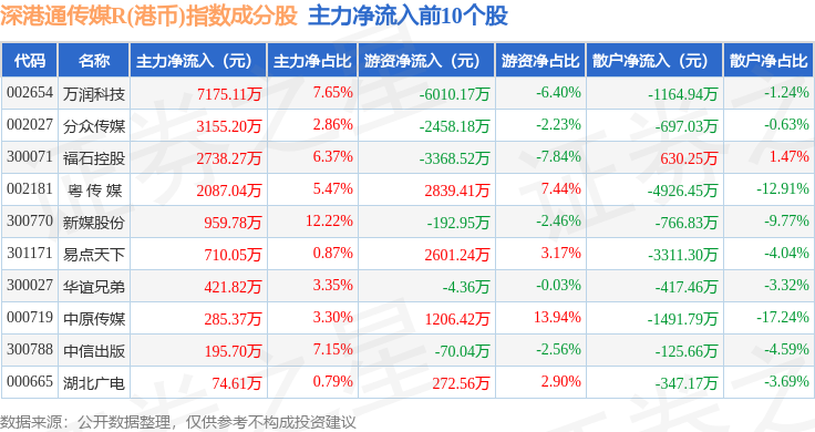 资金流向方面,深港通传媒R(港币)(483076)指数成份股当日主力资金净流出合计10.33亿元,游资资金净流入合计3.72亿元,散户资金净流入合计6.61亿元。成份股资金流向详情见下表:
