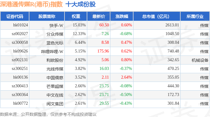 深港通传媒R(港币)(483076)指数十大成份股详情如下: