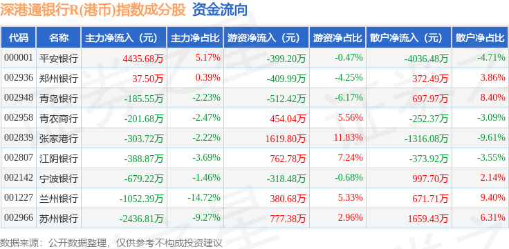 资金流向方面,深港通银行R(港币)(483082)指数成份股当日主力资金净流出合计775.05万元,游资资金净流入合计2354.59万元,散户资金净流出合计1579.54万元。成份股资金流向详情见下表: