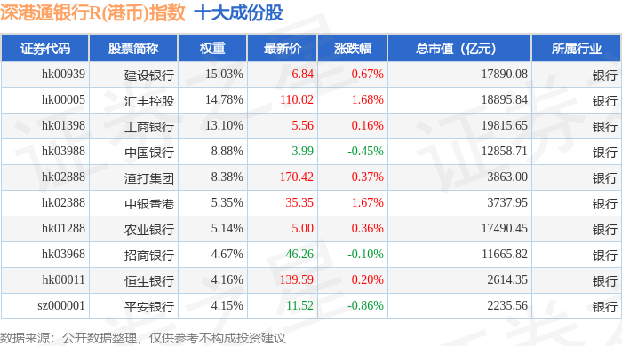 深港通银行R(港币)(483082)指数十大成份股详情如下: