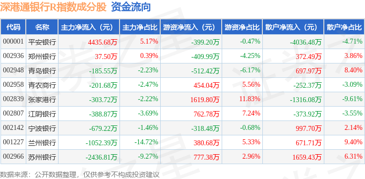 资金流向方面,深港通银行R(483081)指数成份股当日主力资金净流出合计775.05万元,游资资金净流入合计2354.59万元,散户资金净流出合计1579.54万元。成份股资金流向详情见下表: