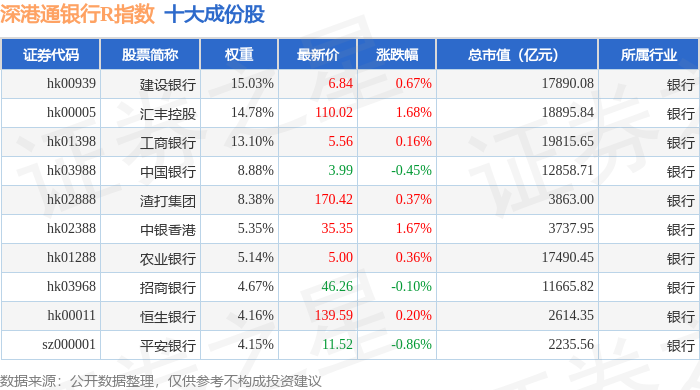 深港通银行R(483081)指数十大成份股详情如下: