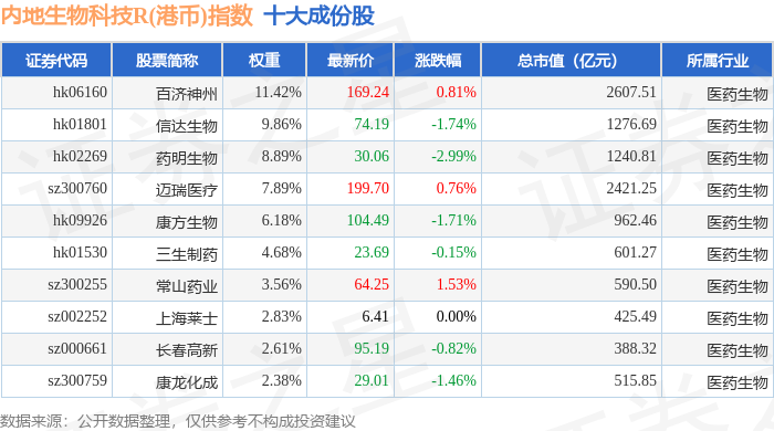内地生物科技R(港币)(483102)指数十大成份股详情如下: