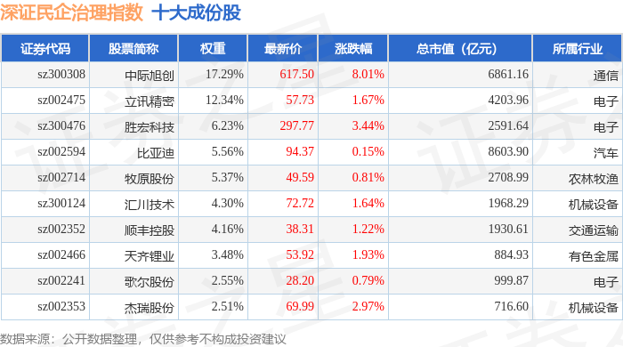 证券之星消息,12月22日,深证民企治理(970058)指数报收于2033.92点,涨2.05%,成交1040.92亿元,换手率1.71%。当日该指数成份股中,上涨的有34家,中际旭创以8.01%的涨幅领涨,下跌的有15家,华利集团以2.84%的跌幅领跌。