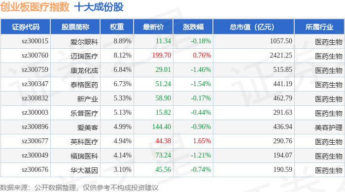 创业板医疗(970082)指数十大成份股详情如下: