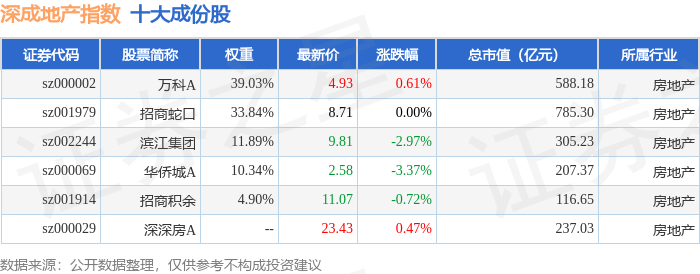 证券之星消息,12月22日,深成地产(971001)指数报收于424.3点,跌0.48%,成交23.81亿元,换手率1.43%。当日该指数成份股中,上涨的有2家,万科A以0.61%的涨幅领涨,下跌的有3家,华侨城A以3.37%的跌幅领跌。