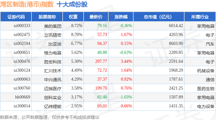 湾区制造(港币)(980010)指数十大成份股详情如下: