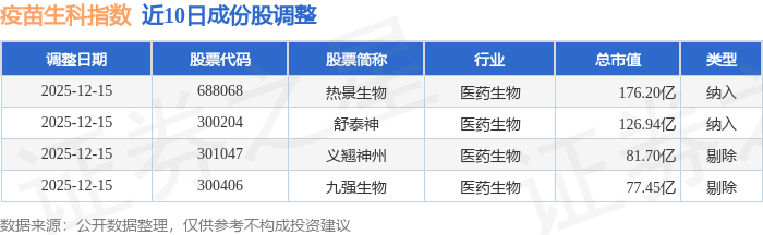 近10日内疫苗生科(980015)指数成份股做了调整,新纳入了2只股票,剔除了2只股票。