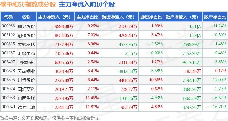 资金流向方面,碳中和50(980021)指数成份股当日主力资金净流出合计6.09亿元,游资资金净流入合计3.45亿元,散户资金净流入合计2.64亿元。成份股资金流向详情见下表: