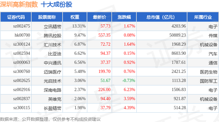 深圳高新(980038)指数十大成份股详情如下: